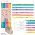 Hver pen har en bred, vinklet spids i den ene ende og en smal tuschspids i den anden og sættet består af følgende