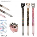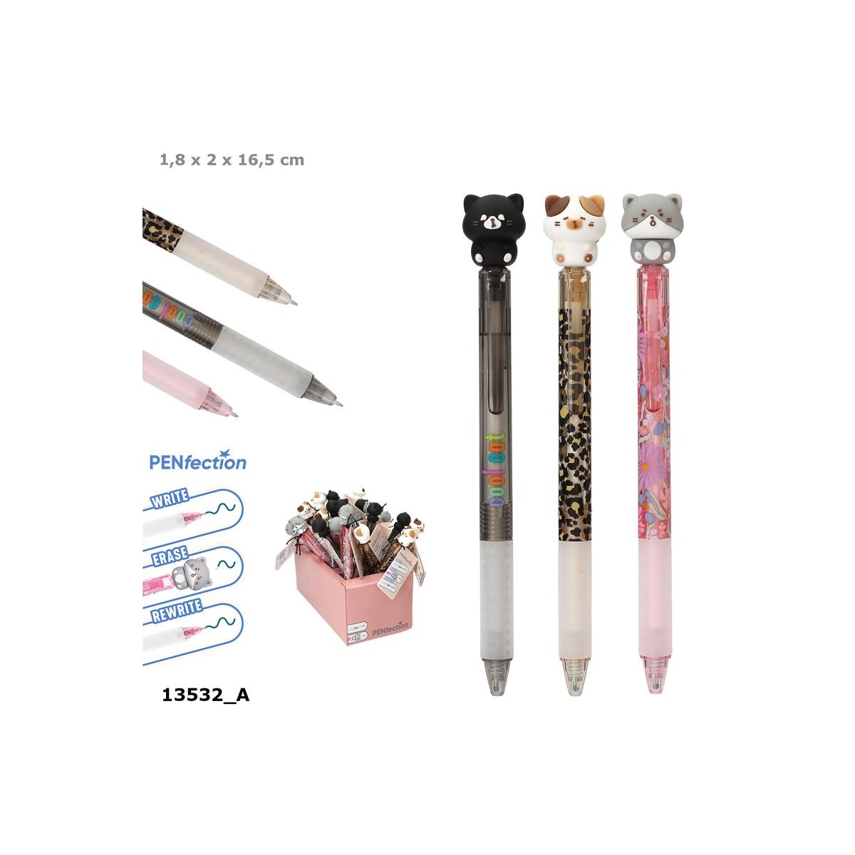 Skriv, slet og skriv igen! Det er sjovt at skrive med denne gelpen fra PENfection. Pennene har en super sød, kattefigur på toppen, der fungerer som viskelæder (varmefølsomt blåt blæk, der forsvinder gennem friktion, når det opvarmes).