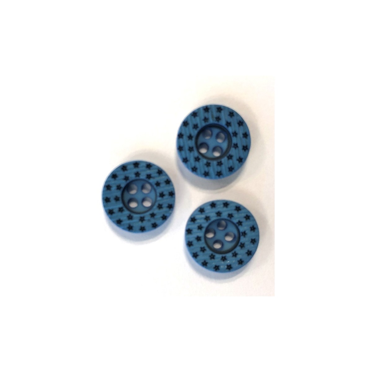Blå knap med stjerner i sort. 4 huls knap 12 mm