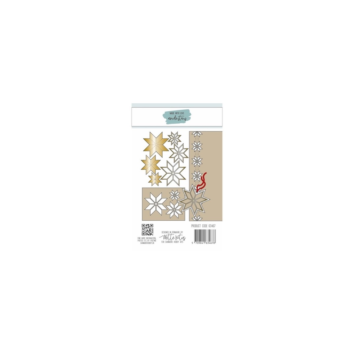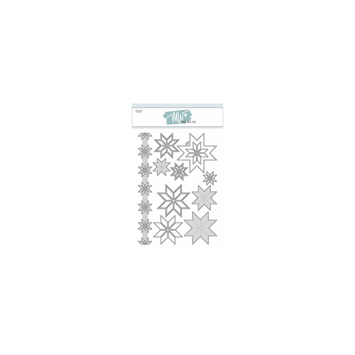 Nordic Stars fra Made With Love indeholder 11 dies med klassiske stjerner: 1 linje med hul udskæring og baggrundseffekt, 3 solide stjerner, 3 stjerner med tynd kant, 3 stjerner der skærer hul og endelig et tag der passer til den store stjerne.